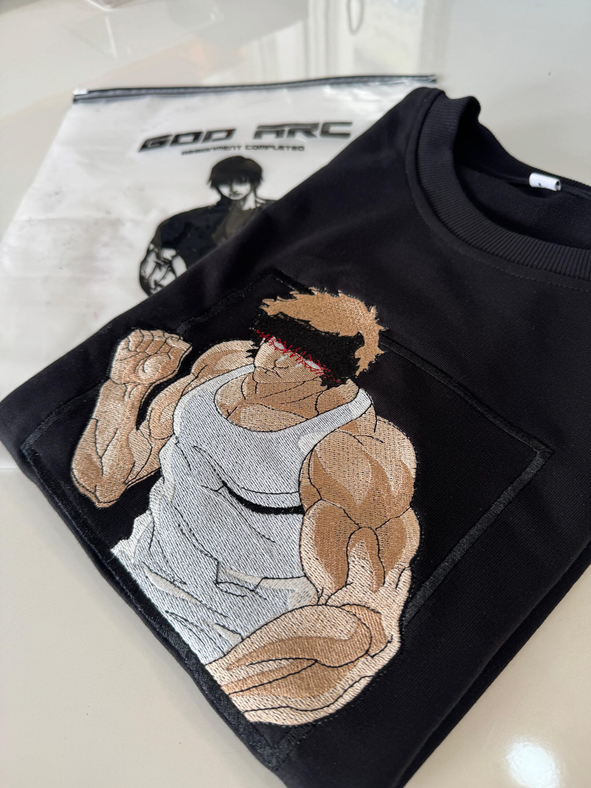 Channel unstoppable power with the Baki – Muscle Mode Tee. Designed for anime and streetwear lovers, this premium black t-shirt showcases intricate, high-thread embroidery of a muscle-bound fighter in a fierce pose. Made from soft, breathable cotton, it offers maximum comfort without sacrificing bold visual appeal. The embroidery alone takes hours to craft — ensuring detail, durability, and definition. Whether you’re at the gym, on the streets, or in your zone, this tee delivers serious impact. Packed in exclusive GOARC anime-themed packaging, it’s more than fashion — it’s a statement. Made in India. Designed for warriors.