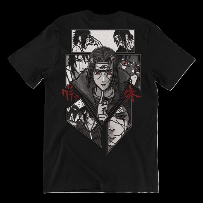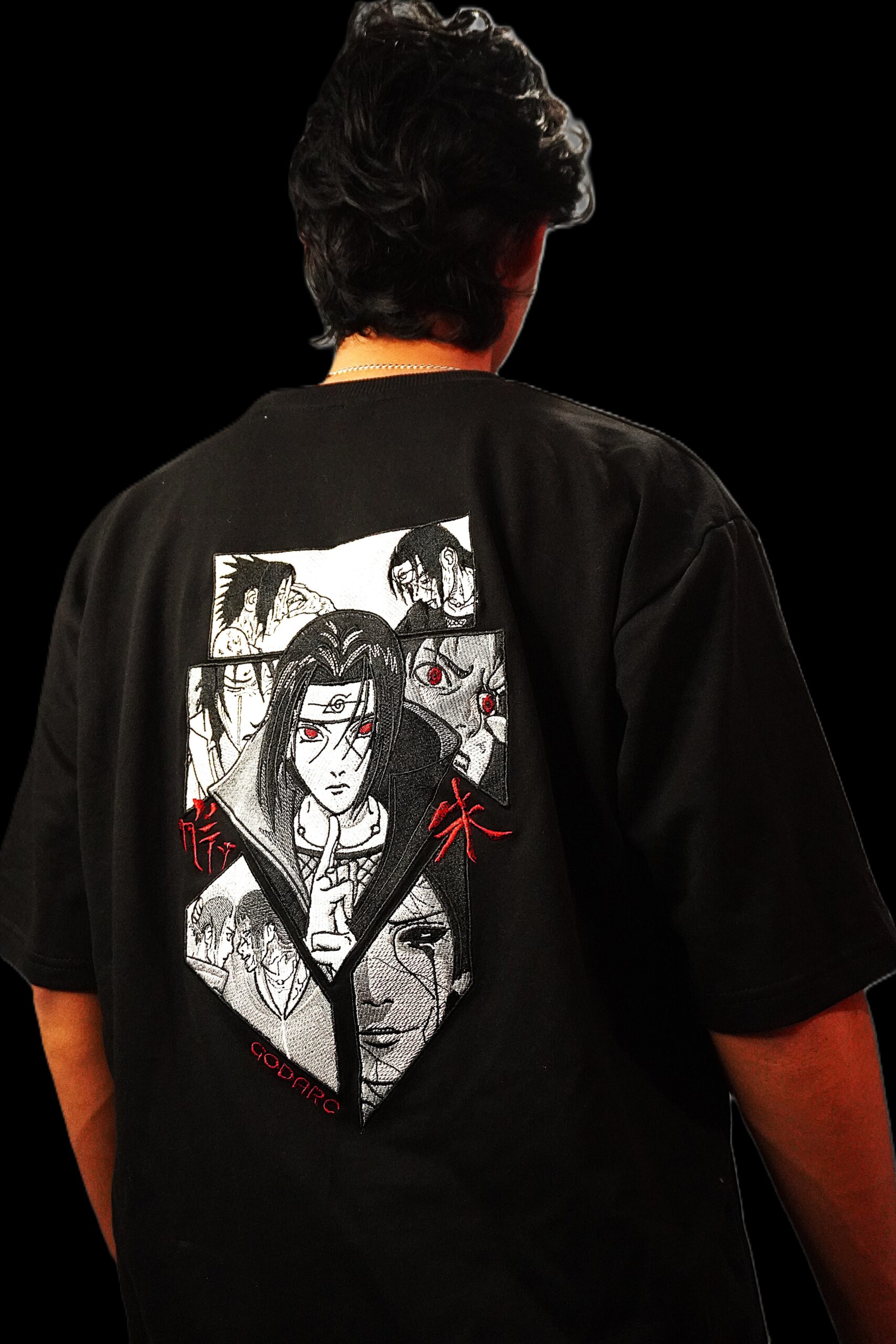 Dive into the darkness of brotherhood, betrayal, and power. This premium black tee features detailed embroidery of iconic moments and characters inspired by the Uchiha legacy. A must-have for true anime fans.